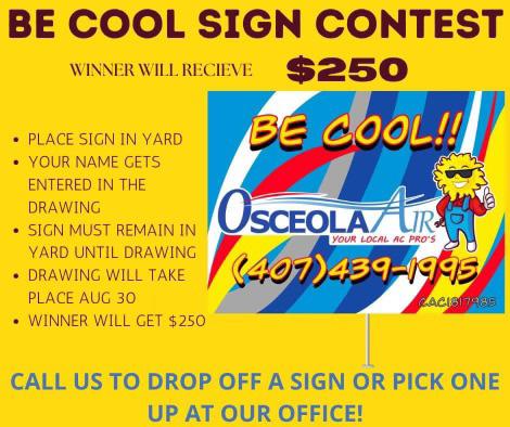 Osceola Air is inviting local residents to participate in their “Be Cool” Yard Sign Contest, where one lucky winner will receive a $250 cash prize. To enter, participants simply need to place the “Be Cool” sign in their yard, and their name will be automatically entered into a drawing.