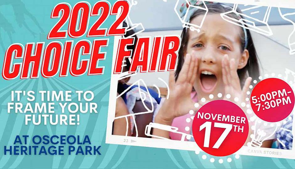 The Osceola School District will host a Choice Fair on November 17, 2022, from 5:00 p.m. to 7:30 p.m. in the Events Center at Osceola Heritage Park to showcase the highquality options available to students and their families in kindergarten through Grade 12.