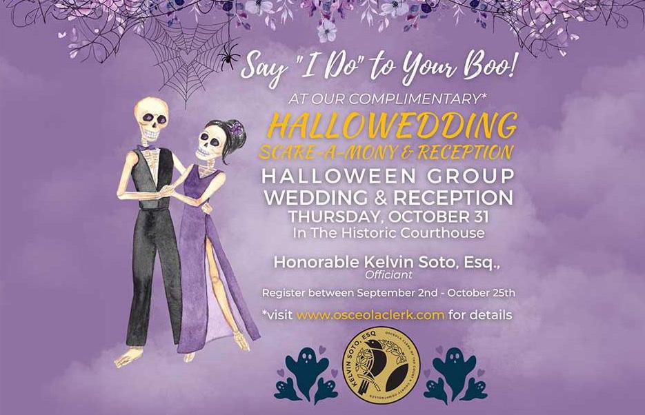 Osceola County Clerk & Comptroller Kelvin Soto, Esq. invites 25 couples to say “I Do” to their BOO this Halloween at the third annual HalloWedding Group Wedding “Scare-AMony” and Reception—an eerily epic way to pledge eternal love!