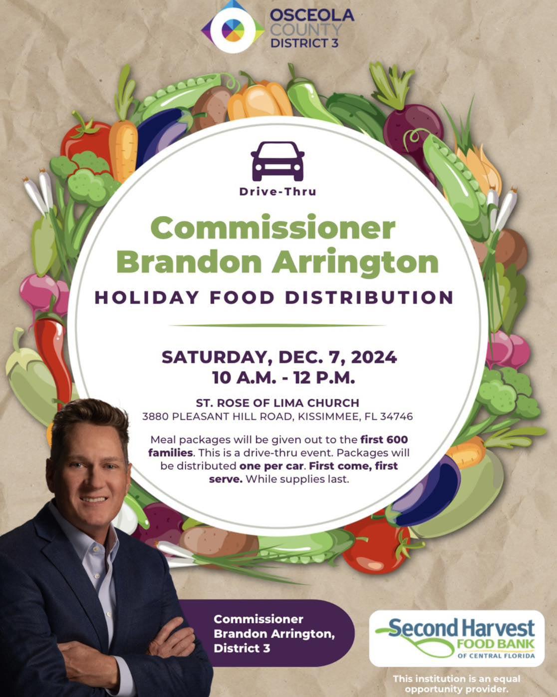 Osceola County Commissioner for District 3, Brandon Arrington, in partnership with Second Harvest Food Bank, is hosting a Drive-Thru Holiday Food Distribution to support families in need on Saturday, December 7, from 10:00 a.m. to 12:00 p.m. at St. Rose of Lima Church in Kissimmee.