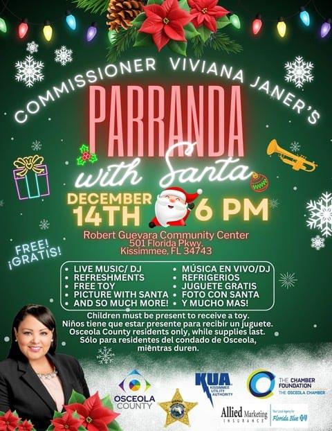 Osceola County residents are invited to join Commissioner Viviana Janer for a joyful evening of holiday cheer at the annual Parranda with Santa event on Thursday, December 14th, at 6 PM. The celebration will take place at the Robert Guevara Community Center, located at 501 Florida Parkway in Kissimmee.