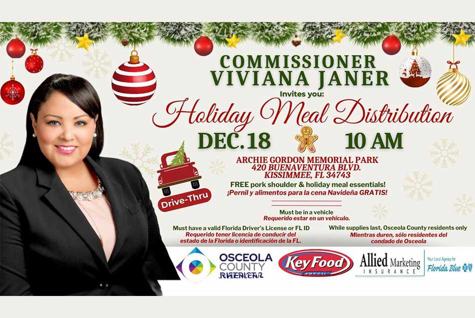 Osceola County Chairwoman Viviana Janer (District 2) is inviting residents to a Free Holiday Meal Distribution on Wednesday, December 18, 2024, at Archie Gordon Memorial Park, 420 Buenaventura Blvd. in Kissimmee. The event begins at 10 a.m. and will continue until supplies last.