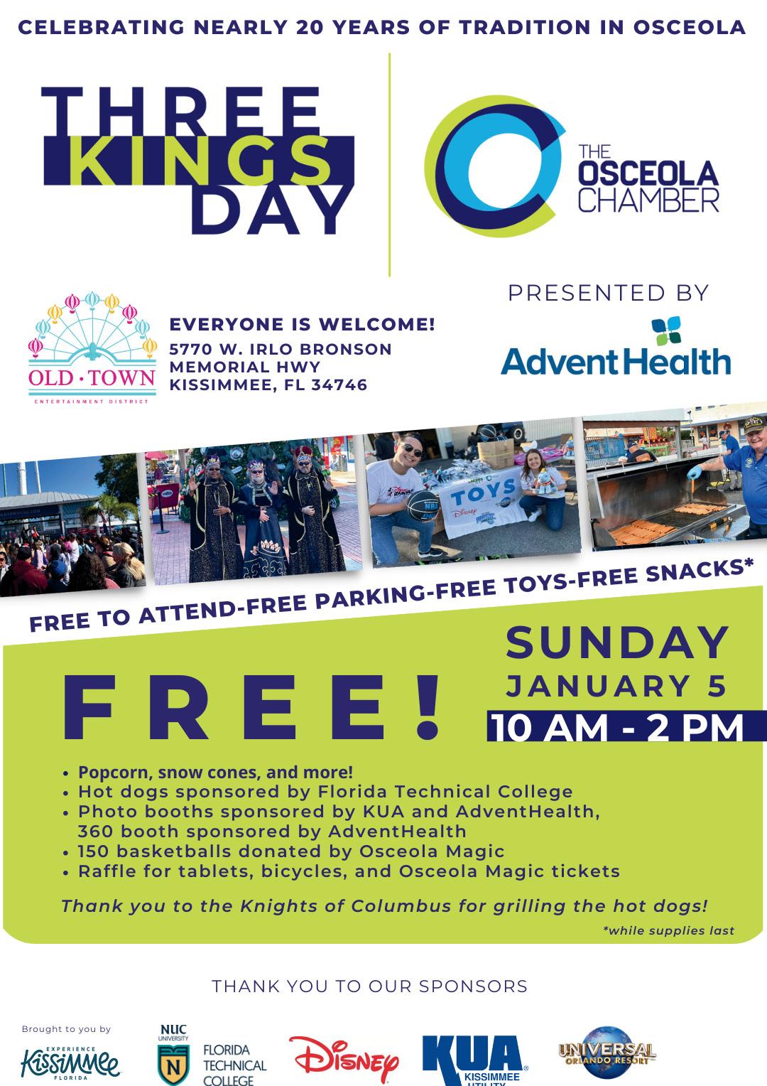 The Osceola Chamber will host the 20th Annual Three Kings Day Osceola Celebration on Sunday, January 5, 2025, from 10:00 a.m. to 2:00 p.m. at Old Town in Kissimmee, presented by AdventHealth, brought to you by Experience Kissimmee.