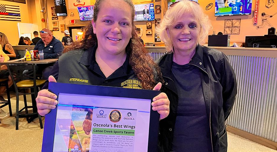 In a celebration of culinary excellence and community spirit, Canoe Creek Sports Tavern in St. Cloud received the prestigious “Osceola’s Best Wings Award” on Thursday, presented to owner Stephanie Chmielewski by Positively Osceola. The highly coveted recognition is a testament to Canoe Creek Sports Tavern’s commitment to delivering not only positively delicious food, but also fostering a welcoming environment for locals and visitors alike. The award underscores Canoe Creek Sports Tavern’s dedication to exceptional customer experiences.
