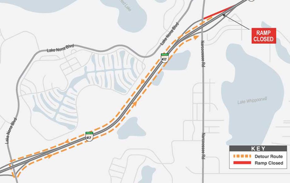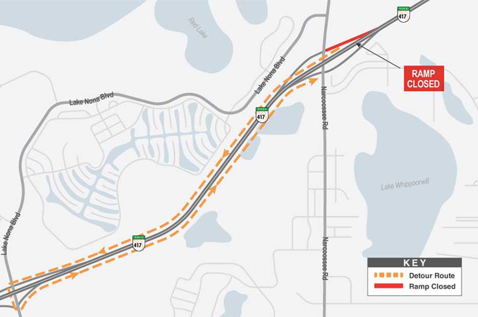 • Sunday, April 28 to Tuesday, April 30, from 9 p.m. to 6 a.m.: The ramp from southbound SR 417 to Narcoossee Road (Exit 22) will be closed nightly for road work. During this time, drivers will be directed to continue south on SR 417 to Lake Nona Boulevard (Exit 19). Tolls associated with this detour will be suspended while it is in place.