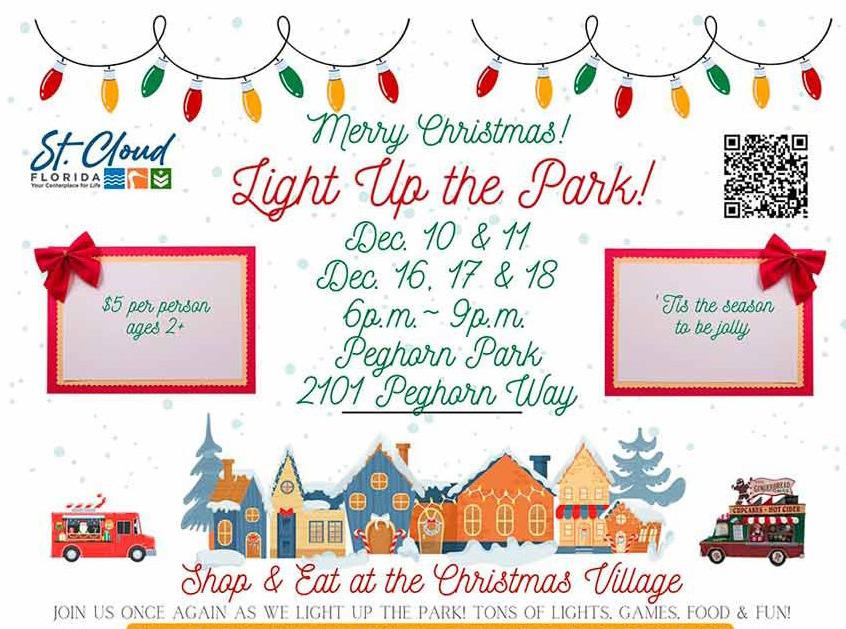 The City of St. Cloud will “Light Up the Park” on December 10, 11, 16, 17 & 18 from 6 p.m. to 9 p.m. at Peghorn Nature Park, located at 2101 Peghorn Way in St. Cloud.