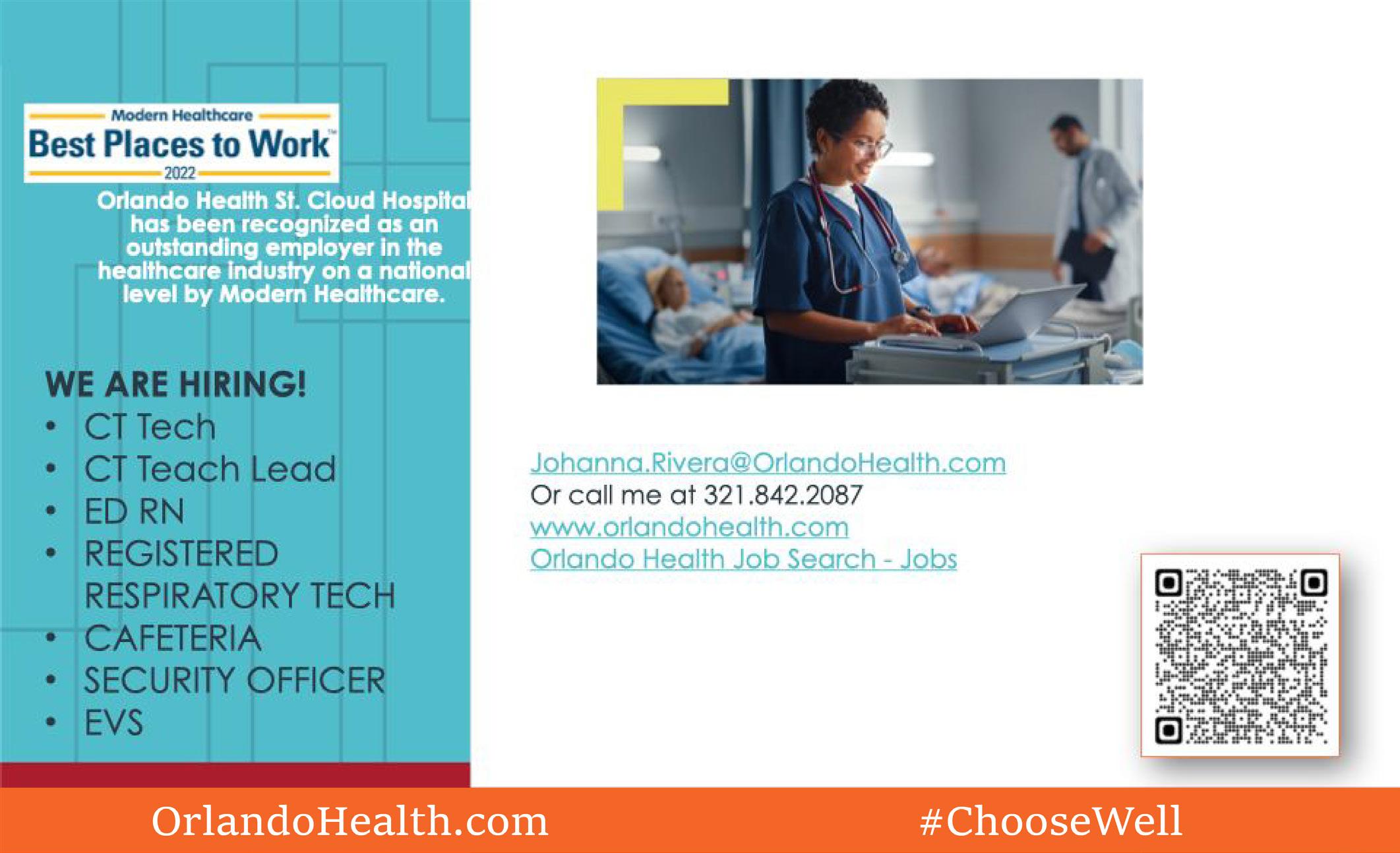 We provide trusted, quality care in your community. At Orlando Health St. Cloud Hospital, get access to care from an expert and compassionate clinical team for all of your healthcare needs — from emergency services to heart care, surgical services and more — all close to home. Giving you more reasons to choose well. OrlandoHealth.com/StCloud choose well.