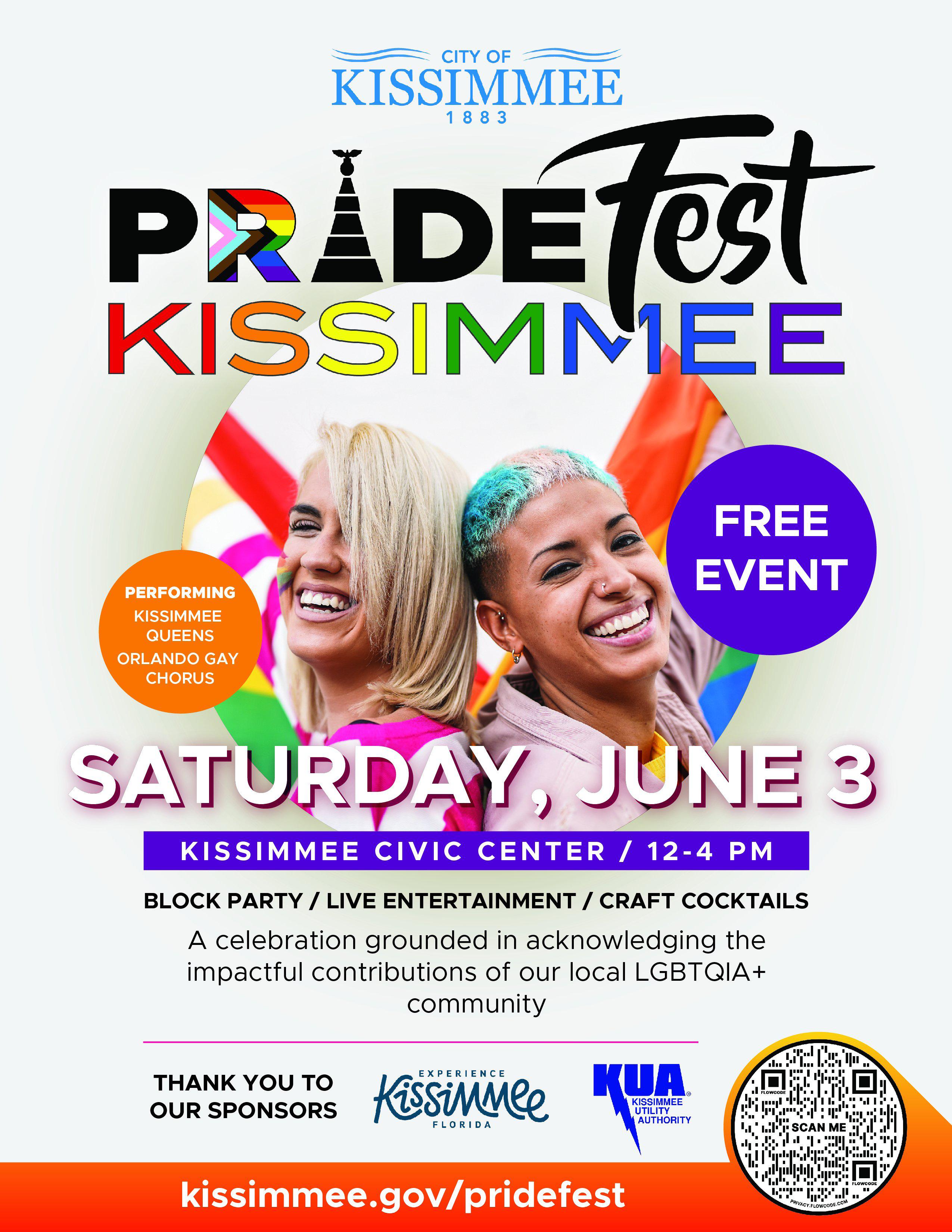 On June 3rd, 12-4pm, Pridefest Kissimmeee, sponsored by Kissimmeee Utility Authority and Experience Kissimmeee, forster awareness and acknowledges the contributions of the LGBTQIA+ community.