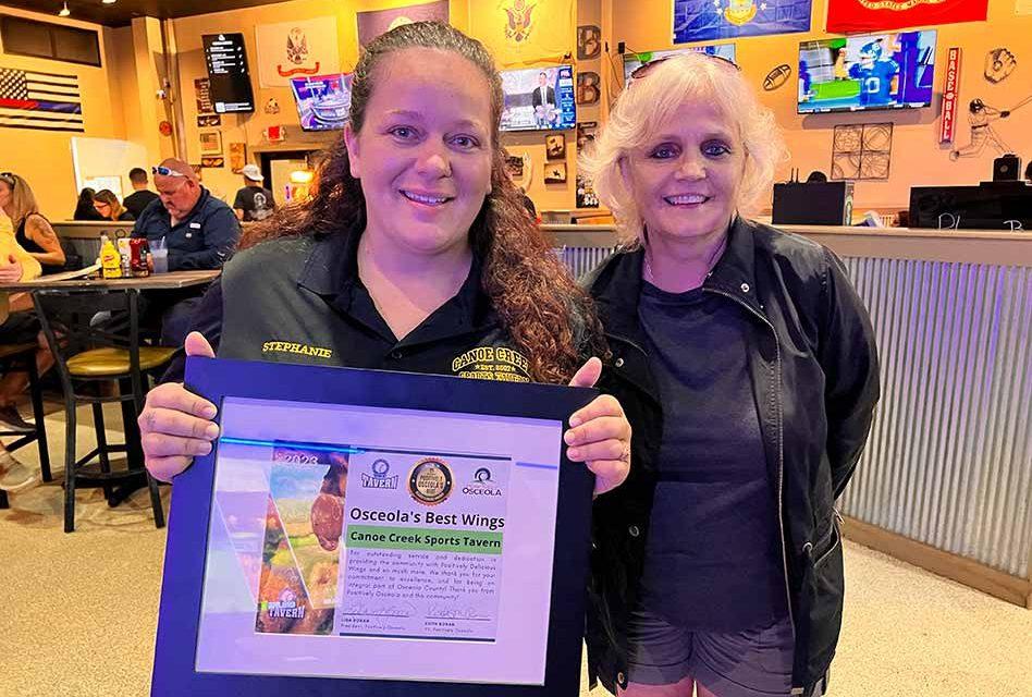 In a celebration of culinary excellence and community spirit, Canoe Creek Sports Tavern in St. Cloud received the prestigious “Osceola’s Best Wings Award” on Thursday, presented to owner Stephanie Chmielewski by Positively Osceola. The highly coveted recognition is a testament to Canoe Creek Sports Tavern’s commitment to delivering not only positively delicious food, but also fostering a welcoming environment for locals and visitors alike. The award underscores Canoe Creek Sports Tavern’s dedication to exceptional customer experiences.