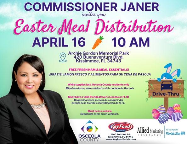 Osceola County District 2 Commissioner and Chairwoman Viviana Janer is inviting the community to a special Easter Drive-Thru Meal Distribution on Wednesday, April 16 at 10 a.m. at Archie Gordon Memorial Park, located at 420 Buenaventura Blvd. in Kissimmee.