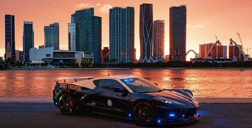FHP’s entry features a striking photo of its newest cruiser—a sleek black and tan Corvette—set against the backdrop of a glowing Miami skyline at sunset. The vehicle, seized from a convicted drug trafficker during a joint FHP-DEA operation, now serves as a community outreach tool to promote traffic safety and the agency’s “Arrive Alive” initiative.