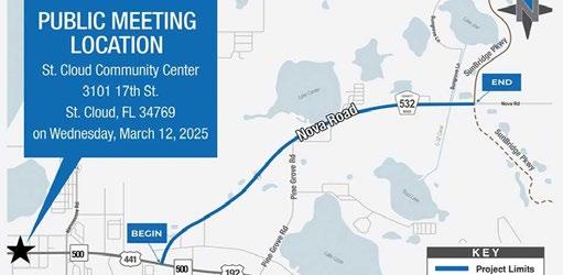 In-Person Option: The community is invited to attend an open house at the St. Cloud Community Center, Magnolia Room, 3101 17th Street, St. Cloud, Florida 34769 on Wednesday, March 12, 2025. Attendees will have an opportunity to come anytime between 5:30 p.m. and 7:30 p.m. to view a looping presentation and project displays, speak with project team members, and provide comments.