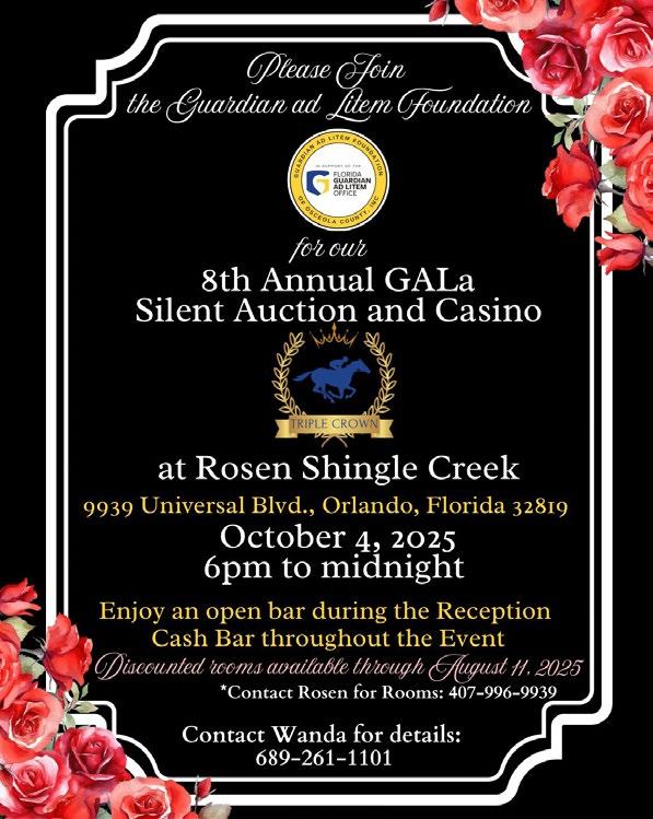 The Guardian ad Litem Foundation of Osceola County will host its 8th Annual GALa Silent Auction and Casino on Saturday, October 4, 2025, from 6 p.m. to midnight at Rosen Shingle Creek, located at 9939 Universal Blvd. in Orlando. Tickets for the gala are on sale through September 15.