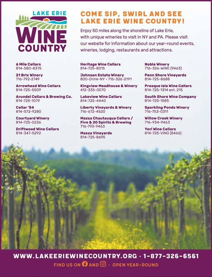 According to the Chautauqua County Visitors Bureau, the Lake Erie Grape Belt features more than 30,000 vineyard acres along a 50-mile Lake Erie Wine Trail. The trail includes 23 wineries spanning throughout Chautauqua County and neighboring Pennsylvania, collectively referred to as Lake Erie Wine Country.