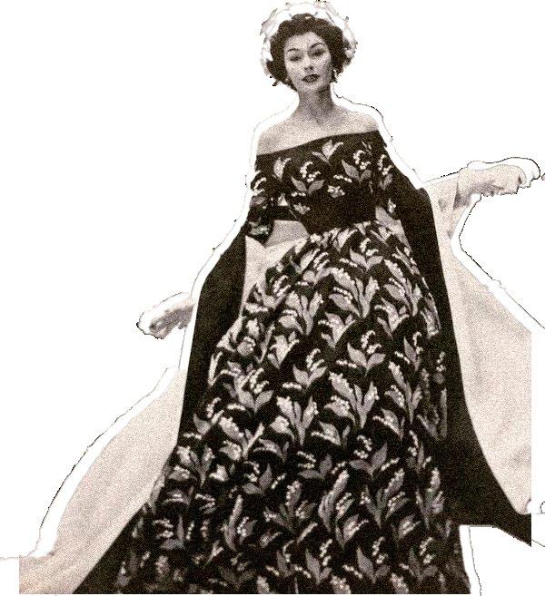 La extravagancia de los motivos de chícharo bordados y su colocación simétrica en el vestido son características distintivas del trabajo de la alta costura francesa. El vestido Les Muguets, que estaba cubierto de vainas de semillas de lirio de los valles sobre un fondo negro, se ganó incluso los elogios de Cristóbal Balenciaga cuando conoció a Hubert de Givenchy en Nueva York en el verano de 1953.