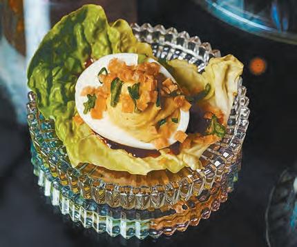 But where Powder Room truly shines is in its inventive Little Luxuries section. Mini wagyu hot dogs, or Wagyu Pups, arrive in toasted milk buns with a flourish of caviar, and the tempura Nova Scotia lobster is crisp, delicate and brightened with a citrus emulsion. Even the potato gets a makeover: the Potato Poppers are stuffed with mozzarella di bufala, smoked guanciale and topped with a glint of caviar.