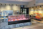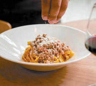 offerings, like cannoli. Earthy tones create an open, bright vibe, transitioning the grocery section to a dining space at the back. The lunch menu features rotating sandwiches, including a standout: the homemade meatball sandwich. Made from pork, veal and beef, it’s slow cooked in tomato sauce and topped with smoked mozzarella.
