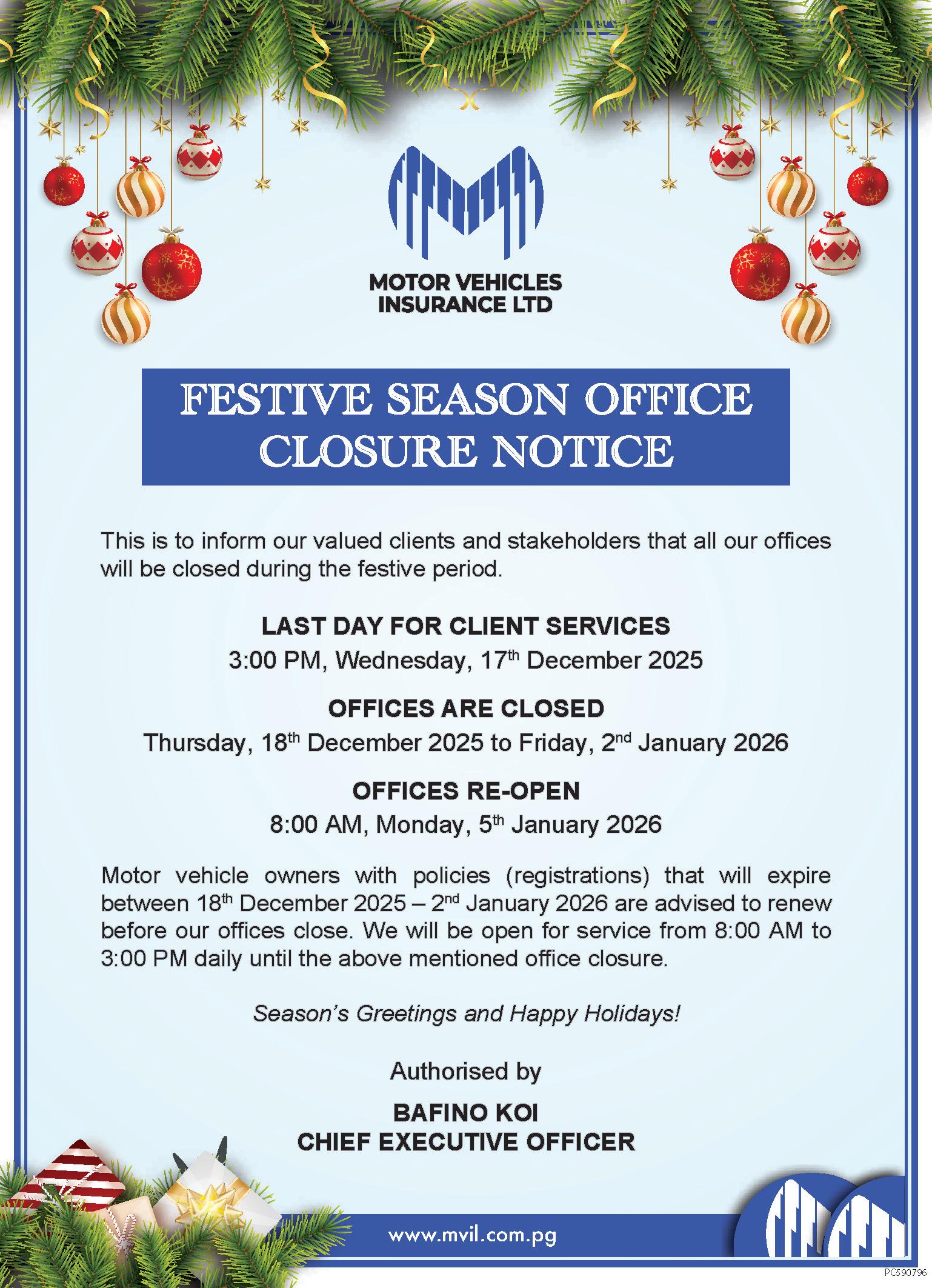 We are getting reports of families waiting to get out of POM to join families in their villages for Christmas, because PX has cancelled their flights. One family reported going to the airport early in the morning for three days last week, after their flights were cancelled each day. One would have thought PX had learnt its lessons from previous Christmas periods to make travelling home for families easier but that is not the case, it seems. Such hiccups does not help the reputation of the national flag carrier.