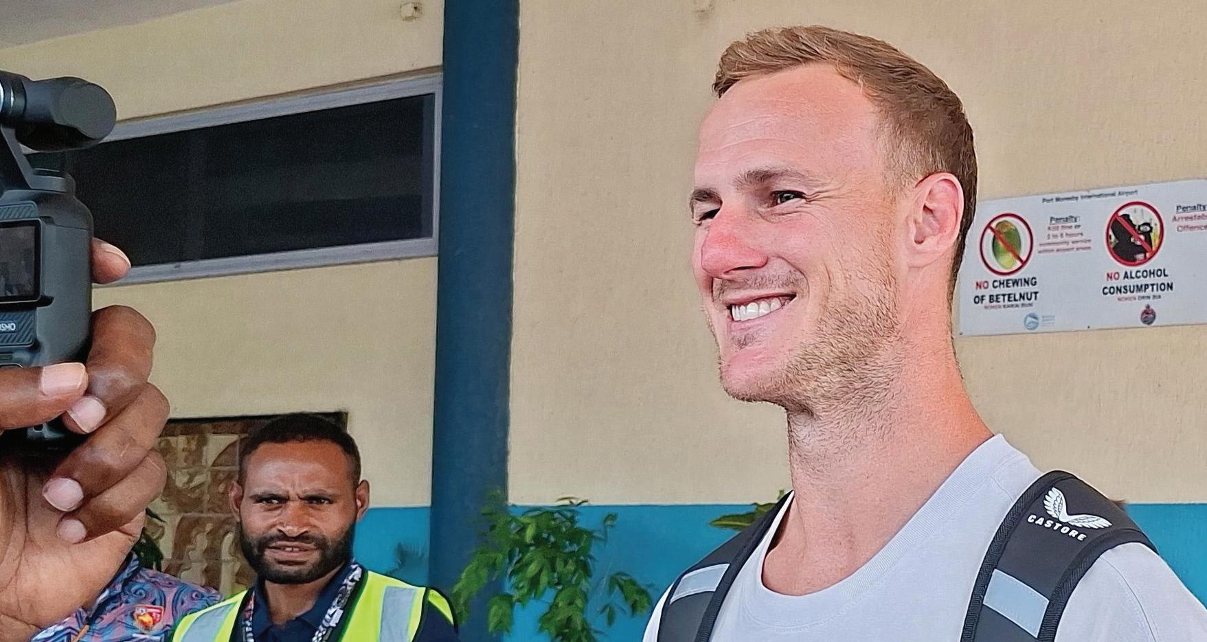 SEVERAL high profile NRL stars landed yesterday in Port Moresby with the Sydney Roosters contingent that will be tackling the historic 96km Kokoda Trail as part of the pre-season program. Pictured is former Australian Kangaroo and NSW Blues fullback James Tedesco arriving at Jackson’s Airport. PICTURE FIDELIS WASARI.