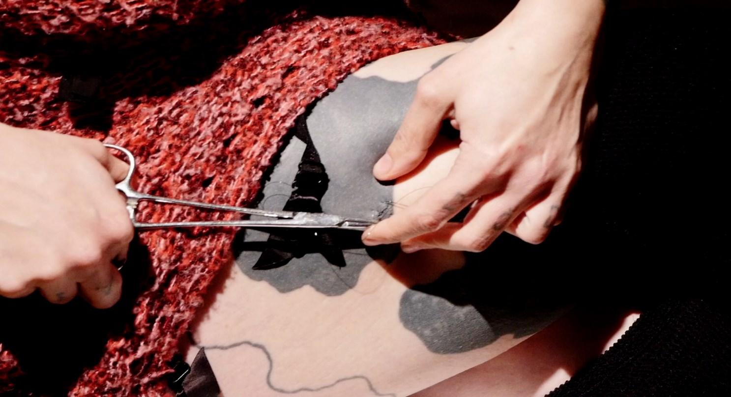 A meia 7/8 é desprendida da liga e presa diretamente nas coxas, a partir do procedimento desutura,discutindoasexualizaçãoefetichização do corpo feminino.
