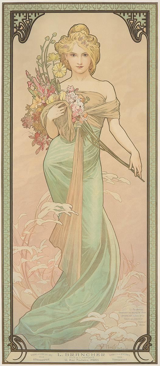 This is a rare complete set of the Four Seasons by de Riquer. More seldom seen than the equivalent series by Mucha, they are the artist’s masterpiece. A letter from the publisher Pierrefort to the artist indicates that the panels were printed on “paper exactly similar to the one used by Mucha for his animated Flowers,” and that, because of the intricate detail and shading within the designs, seven instead of six colors would be used in the printing process. The letter continues: “The artist responsible for the lithographic process is not only skilled in the use of colour but is also an excellent designer. He admires your panels very much and will do everything in his power to reproduce them properly. I have additionally agreed to keep an unflinching eye on the process myself. We shall experiment, something that is not easy, given the size of the lithographic stones” (Art Nouveau/Weill, p. 54). (4)