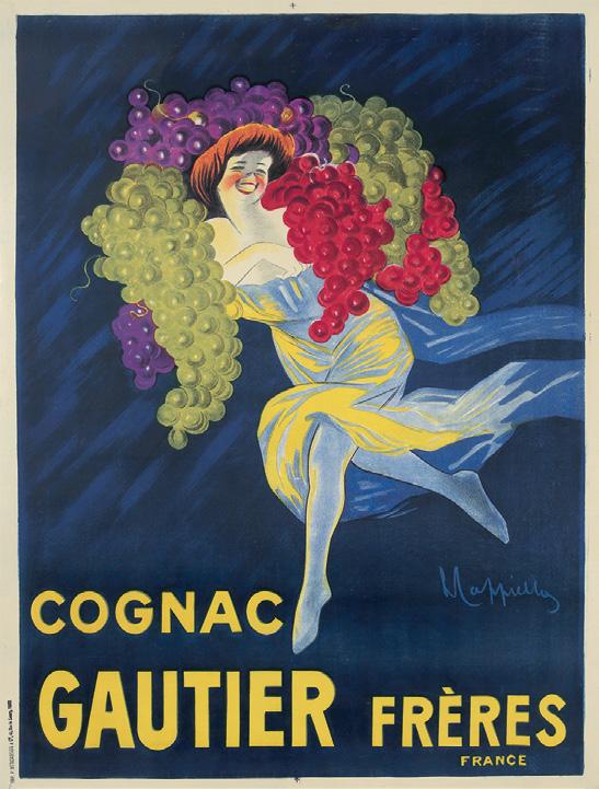 “Although Gautier is one of France’s oldest cognac distillers, there’s nothing old-fashioned about this ebullient eyeful bringing forth her vineyard-fresh bounty. You’d think that she’d appear at least slightly burdened beneath the heft of these hardy bunches as she trips the vine fantastic; the knowledge that she’s delivering a taste this enormous, however, keeps the spring in her step. This enterprise, which survives to this day, was established by Guy Gautier in 1697... Gautier’s success was partly due to the fact that he sided with the insurrectionists in one of the religious wars that took place in his time; when they won, he was named governor of the Cognac province, and he in turn passed its name to the brandy he had produced” (Cappiello/Rennert, p. 103).