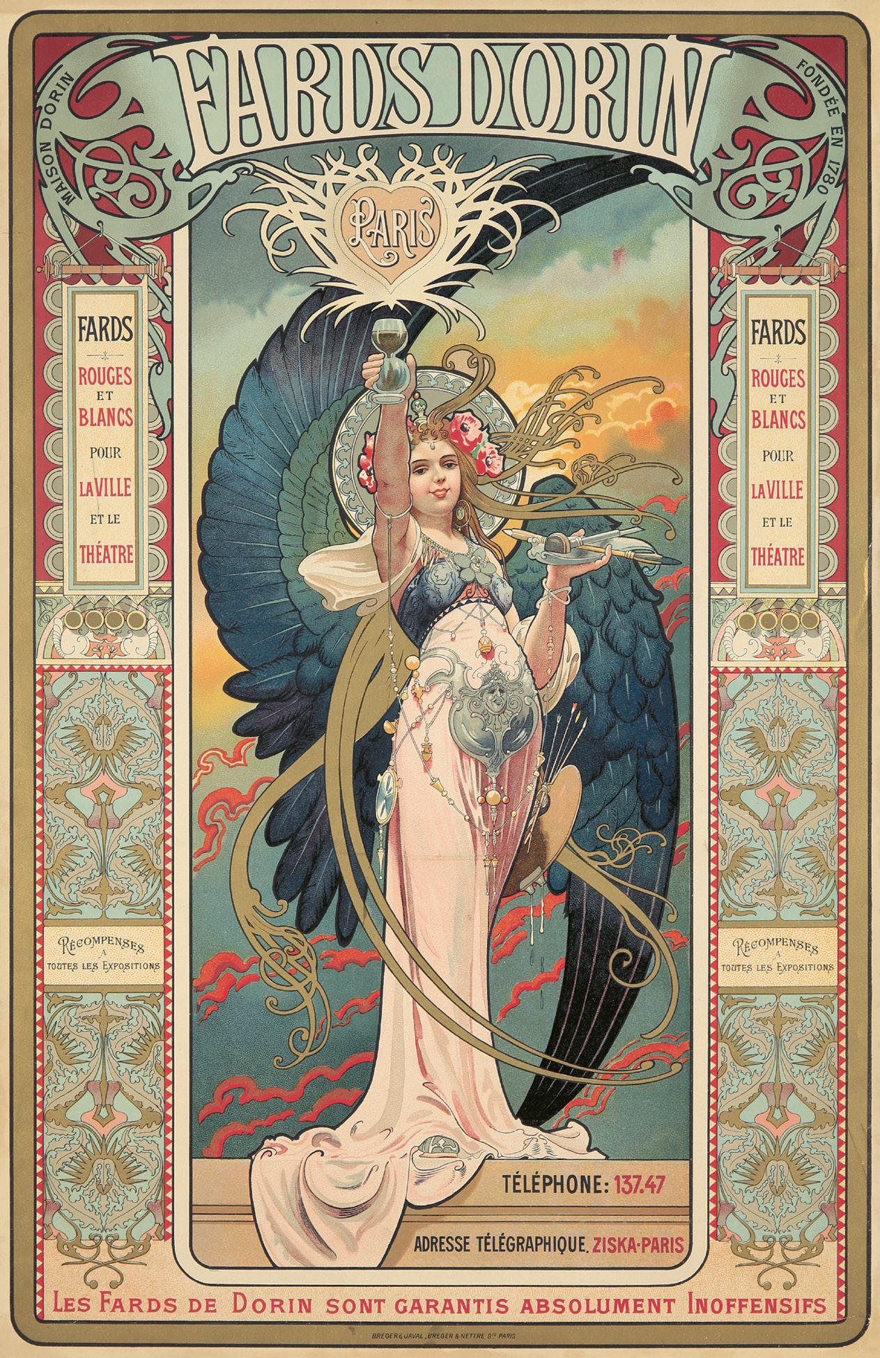 This is a rare proof before letters in the smaller format. “We know just enough about Jane Atché to be intrigued. She was born in Toulouse, worked in lithographic prints—at first in black and white only, later in color—and earned an honorable mention at the Salon of the Société des Artistes Français in 1902. Her scarce posters all disclose that Mucha was obviously [a strong influence]” (Wine Spectator, 101). Abdy, in fact, considers Atché one of Mucha’s two best followers in France (p. 100). Of her half dozen known posters, this one for the cigarette paper firm is her most spectacular.