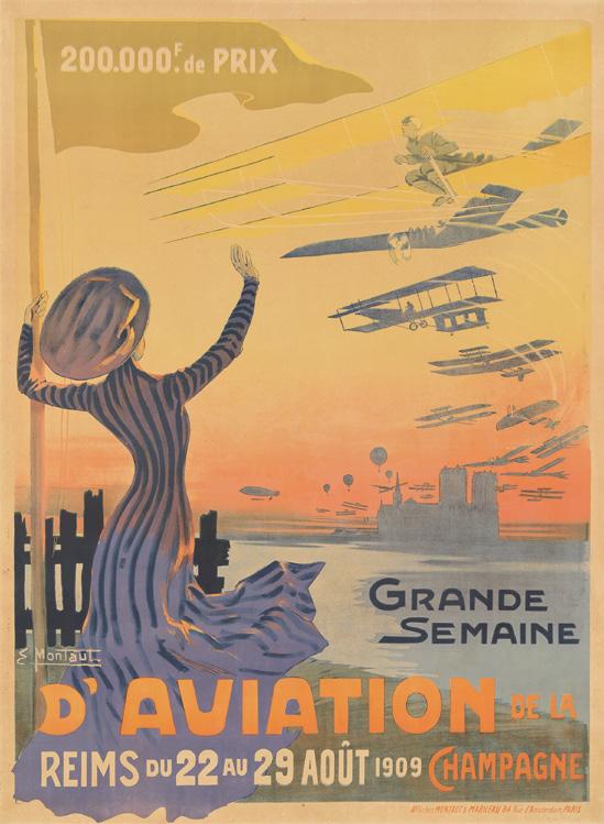 “The true ancestor of the aviation poster genre can be traced to Montaut... for his portrayal of the trailblazing assembly at Reims. Soft tints in the sky indicate that sunset is near, a time of day when the wind was apt to drop and flying was considered to be safer. A svelte female spectator, back to the viewer, lifts her arm in salute to an armada of aircraft rising like a swarm of bees... The curving zebra stripes of her costume—fully consonant with an impression of motion and speed, which after all was the crux of the message delivered by the newfangled flying machine—resonate as effectively as the determined look on the face of the nearest pilot. The Grande Semaine brought together for the first time the world’s greatest fliers. Among them were Louis Blériot, Henry Farman, Léon Delagrange, Hubert Latham, count Charles de Lambert, Louis Paulhan, Roger Sommer, and the American entry, Glenn Hammond Curtiss... Parisians streamed to the event; three thousand Britons came from London by special excursion, and two thousand Americans turned up to root for the single representative of their country. Reims was a watershed in the history of flight. Aviators who had flown ‘before Reims’ were regarded as veterans compared with those who learned to fly later. It dramatically demonstrated the progress made in aviation and provided an incalculable stimulus for the design and production of aeroplanes” (Looping the Loop, p. 42).