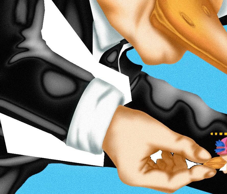 Today I’m sitting on a bench—the one furthest from the entrance—and I’m pretending to read a book. Today I’m thinking and I’m interrupted by this man who comes up to me. He immediately intrigues me; he’s wearing an all-black suit and oval-shaped glasses, seems to be around 60 years old, and is very stronglooking. I notice his badge and feel the weight of authority. He seems almost too calm, too confident, too clean—except for the remains of old finger tattoos, a scar from a former eyebrow piercing, and a keen eye for my leather jacket.