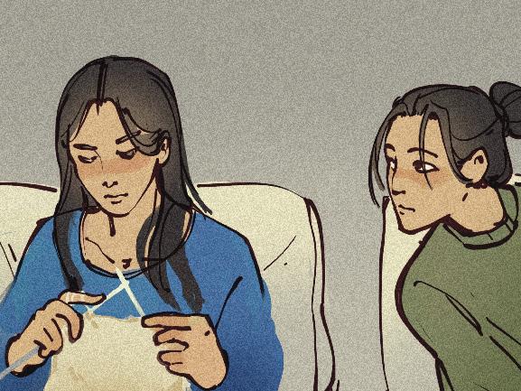 The green situated to the textile, rhythm steadying, her expressions slackening. Yet, my heartbeat quickens, watching her hands move rapidly. There’s a balance: the faster her hands move, the softer her features grow—eyes lowered, half-closed. She looks almost asleep, the way her mouth hangs loosely open. The sound of the metal knitting needles coinciding with each other puts me at ease.