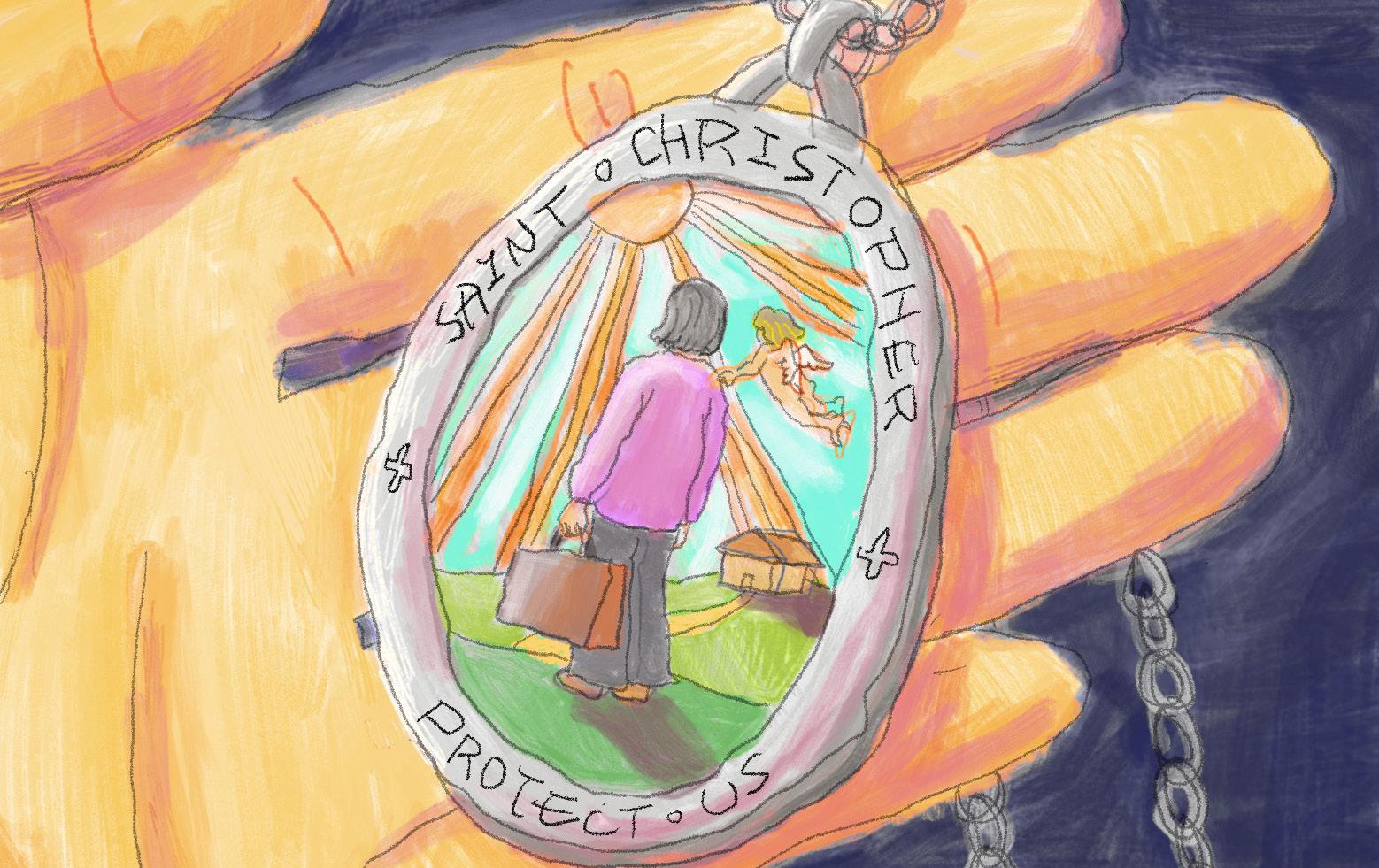 At graveside, my aunt gave me a charm necklace with a St. Christopher medal—the saint of motorists and travelers. When I was back in Rhode Island, I started to pray with it at my bedside. Prayer by prayer for my family, I signed my soul over to a new state, and I began to miss it over there—Connecticut—which wasn't all that far, and with each thought of it I'd miss it more, and it felt farther. In all the time between visits, I collected. Memories, ideas, things—I gained things. Stuff that may never see or know a home.