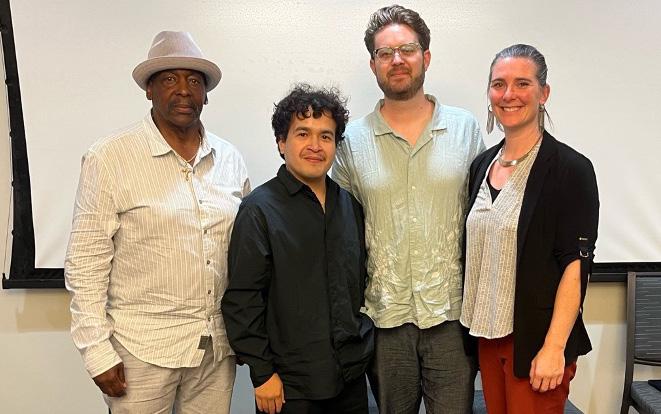 (L-R) Richard “Razor” Johnson, plaintiff and hunger strike survivor; JoeBill Muñoz and Lucas Guilkey, director and producer, respectively, of the film documentary “The Strike;” and event host Caitlin Henry, Criminology and Justice Studies lecturer at Sonoma State University. Photo by Jonathanfitnessjones.