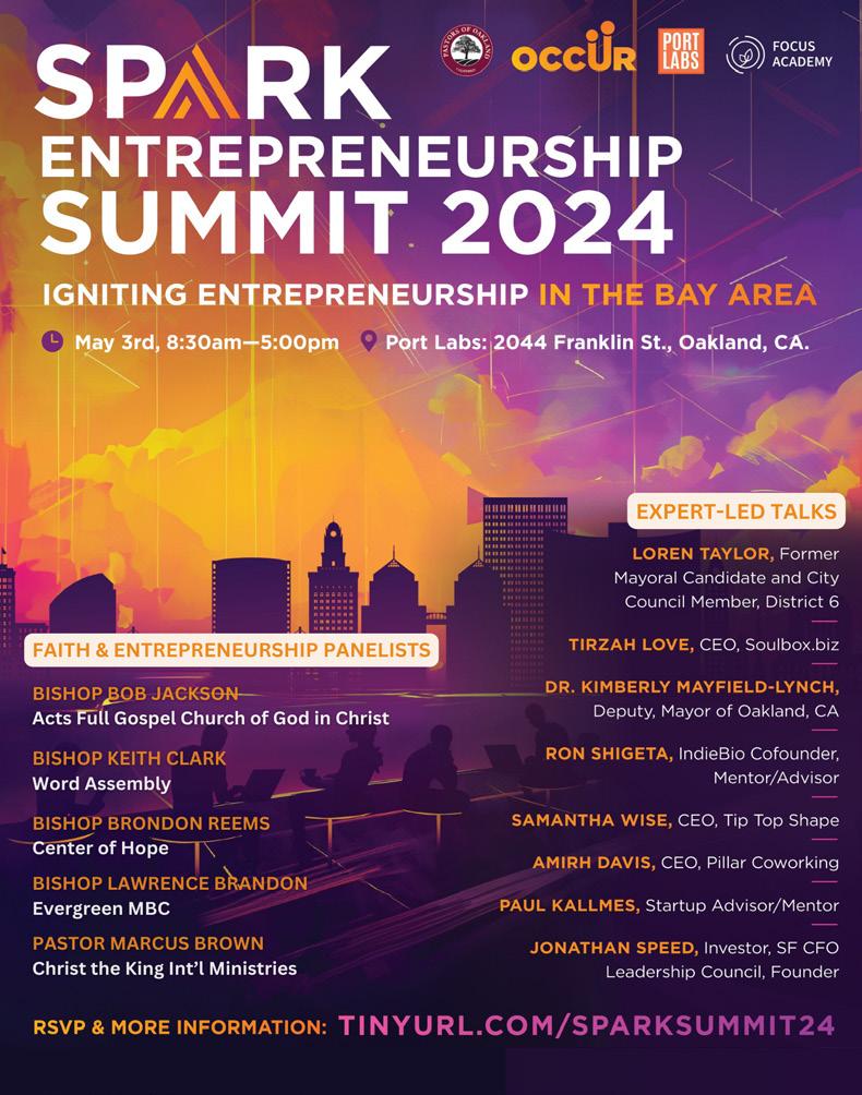 the Founders Academy, through events like the Spark Entrepreneurial Summit, the organization aims to contribute significantly to the economic vitality and resilience of historically excluded communities in Oakland. By leveraging local success stories, the initiative hopes to attract further funding and support, ultimately creating a robust network of thriving young entrepreneurs. You can register for the summit at: https://www.occurnow.org/ sparksummit24 or via Eventbrite tinyurl.com/sparksummit24