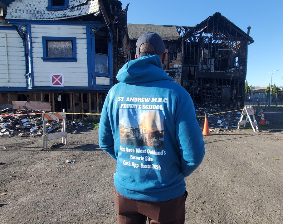 Dr. Robert Lacy, Jr., pastor of St. Andrew Missionary Baptist Church, private school, and theological academy vows to rebuild after the 6-alarm fire and wears the fundraising hoodie. Cash App: $satu2624 or GofundMe Page: Help Save West Oakland’s Historic Site