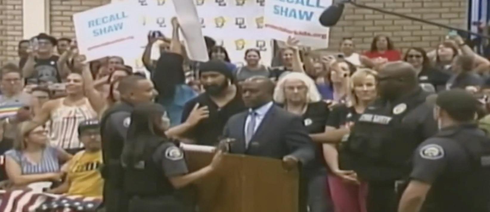 When Thurmond attempted to return to the podium because Shaw’s remarks were directed at him, she called for a five-minute recess. Four security guards followed him from the room and he later said he didn’t sense of hostility from them or the audience.