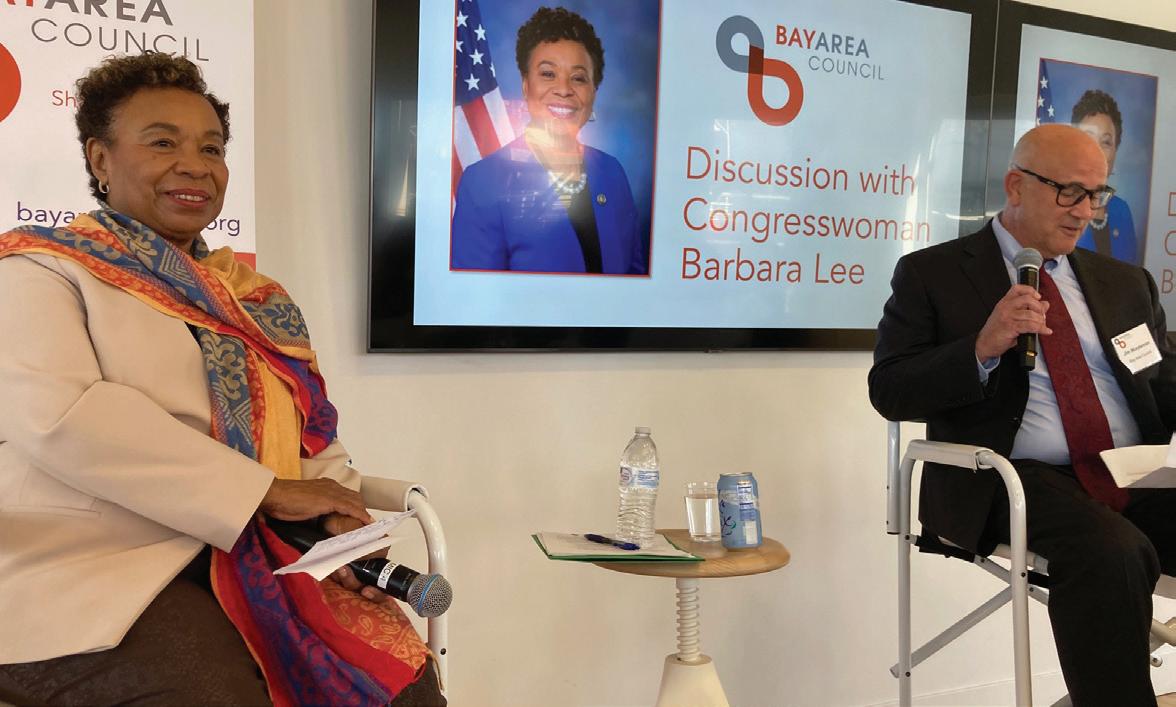 Congresswoman Barbara Lee speaking at the Bay Area Council with program moderator Jim Wunderman, council president and CEO.