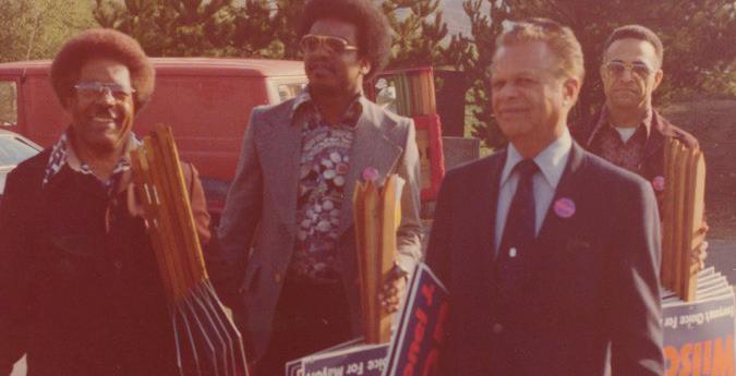 Attorney Clarence Davis, Sandré Swanson, Lionel Wilson and attorney James White campaign door-to-door. Photo from Wilson for Mayor Campaign files.