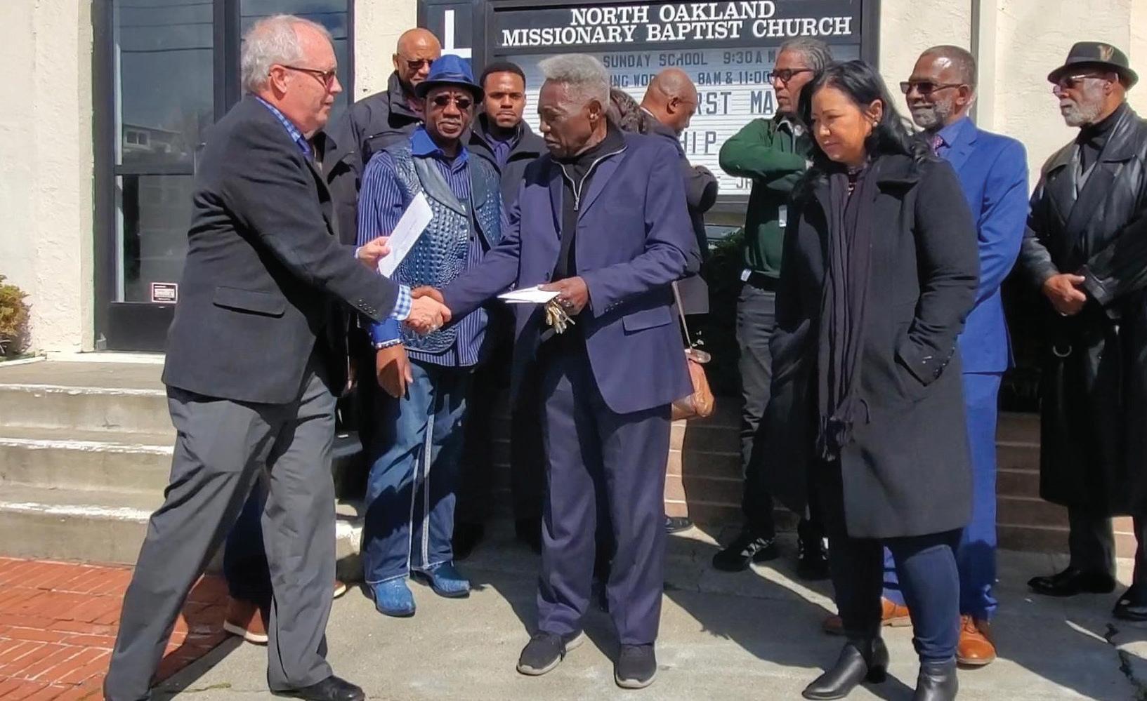 Pastors and elected officials join Pastor Sylvester Rutledge of North Oakland Missionary Baptist Church on Monday to pray, support and present checks for the Alameda County Tax Assessors Office and remove the church from the scheduled action list on March 17.