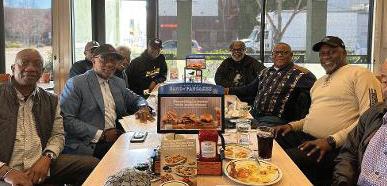 Pastors Chauncey Mathews, Michael Wallace, Anthony Braxton, Gregory Payton, V. K, Jones, E. Wayne Gaddis, Lawrence VanHook and Dr. Willie Estes at I-Hop restaurant in Emeryville on March 7, 2023.