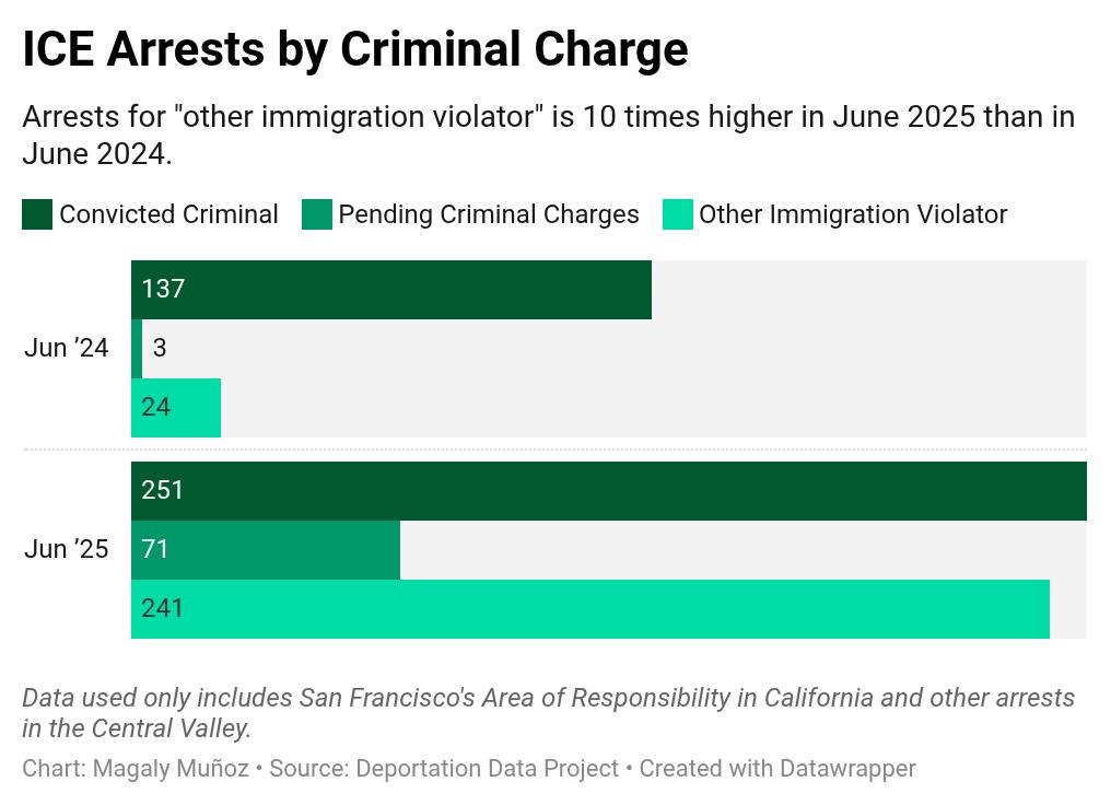 In June 2024, 137 people with criminal convictions were arested and 24 for other immigration violations. But last month, 251 arrests with criminal convictions and 241 arrests with other immigration violations were made by ICE and other agencies.