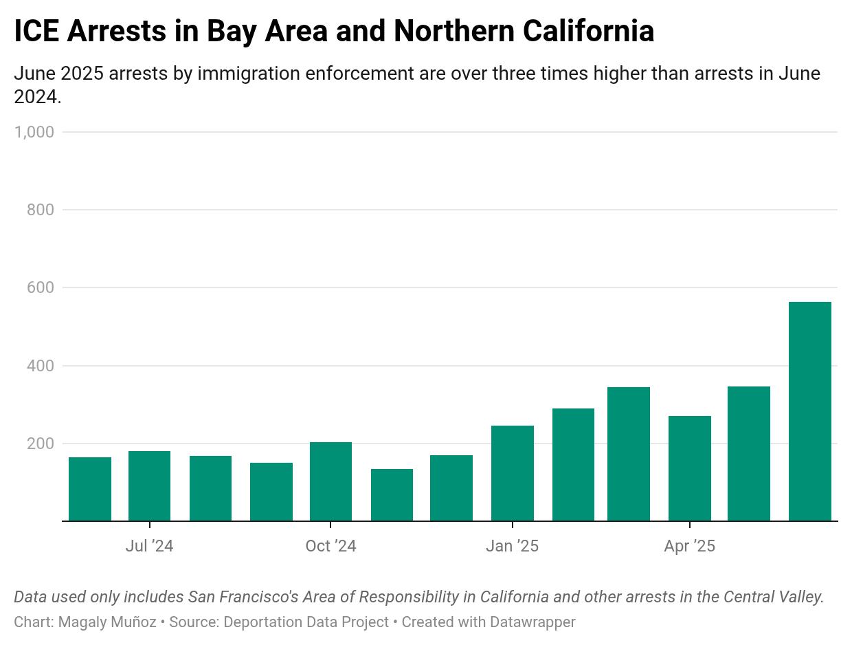 According to an analysis by the Post, arrests from immigration enforcement in California’s San Francisco Area of Responsibility (AOR) was 1.5 times higher in the month of June (563 arrests) than in the first 30 days of Trump’s presidency (364 arrests) in the beginning of the year.