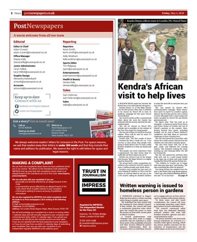 Kendra's African visit to help lives A BOGNOR REGIS pupil has become the British face of an international aid agency. Kendra Diston, 13, of THe Regis School, was the first person other than a celebrity to be chosen by Unicef UK to front its publicity campaign for this year’s Soccer Aid fundraiser. She visited Lesotho to film a promotional video about the work the charity has achieved with the money raised by the starstudded game. THis can be viewed on Unicef UK’s website and is available on the website of the First News paper for young people. She has also written an article for its print edition. THese will be seen by some 2.5 million people in all. Kendra said: “THe first couple of times I watched the film it made me cry. I was nervous at time about what people were going to think about it but I’ve had a really positive feedback to it from my family and friends. “But people can never experience what I experienced. You don’t know what it’s really like out there unless you see it.” Kendra was chosen to go on the unique visit because THe Regis School is so highly rated by Unicef UK. THe school held a video competition for students who wanted to visit the country of some 2 million people near South Africa. Kendra’s entry recalled her late nan’s six years helping ill children in Africa and her desire, as a person blind in one eye, to see a UN charter calling for disabled children