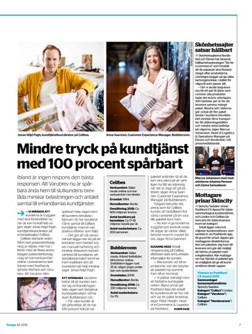 paketet anländer så att de kan vara säkra på att verkligen ha fått sin klänning när det är dags att gå på festen, säger Anna Saarinen, Customer Experience Manager på Bubbleroom. Tidigare betydde det, precis som för Cellbes kunder, att beställaren fick vänta i ovisshet på sin vara tills paketet kom fram. — Nu kan vi ge kunderna trygghet och kontroll under de dagar de väntar, vilket betyder enormt mycket för oss, säger Anna Saarinen. SUSANNE HEED, försäljningsansvarig på Cellbes, efterlyser dock ännu enklare information för kunden.. — Alla kunder vet till exempel inte vad det betyder att paketet har kommit fram till en terminal. — Vi jobbar ständigt med att förbättra kundupplevelsen. Bland annat gör PostNord App det enkelt för kunderna att se hur, när och var ett paket levereras, säger Peter Hesslin, Head of e-Commerce & Logistics på PostNord. KARIN AASE