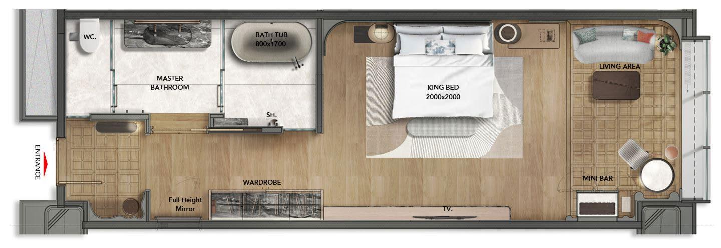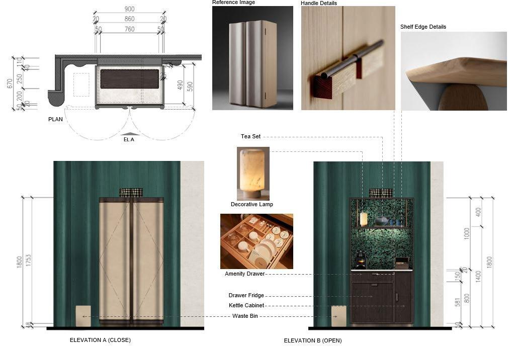 The main concept design of the Hotel draws inspiration from the Kabuki Dance, a classical Japanese theater form blending dramatic performance with traditional dance. Translating this essence into the guestroom design.