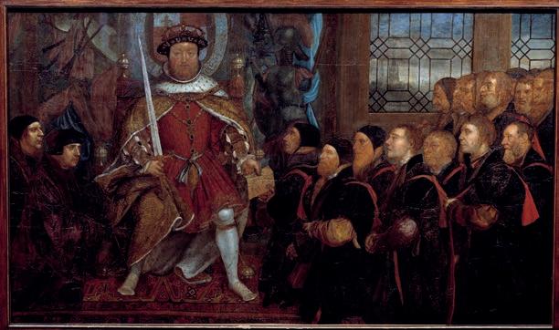 Hans Holbein the Younger. This 1541 group portrait commemorates the union of the Barbers and Surgeons, with Henry VIII presenting a charter to Thomas Vicary, the first Master of the Company. The college’s version is a preparatory cartoon for the final painting, confirmed by radiographic evidence revealing transfer marks beneath the surface.
