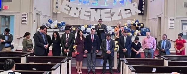 (Above) Raphael Soto speaks to the new employees in Vienna, Virginia. (Below) New employees pose for a group shot in the sanctuary at Vienna church, during an orientation.