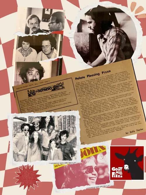 When five friends – Joel and Loris Lipski, Karen Clark (Monely), Ruthann Dickinson, and Philip (Phil) DeAndrade –first opened Goat Hill Pizza it was among a handful of restaurants catering to Potrero Hill. It gained citywide popularity after San Francisco Chronicle columnist Herb Caen wrote about its mascots, Hilda de Anchovy and her two kids, Loretta and Bucky, who roamed the once empty lot behind the restaurant from 1975 to 1985.