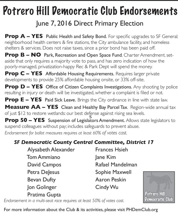 Potrero Dogpatch Merchant’s Association meets the second Tuesday of each month at 10 a.m. at Goat Hill Pizza, corner of Connecticut and 18th streets. Website: http://pdma-sf.org/. Call 415.341.8949. Next meeting: May 10th.