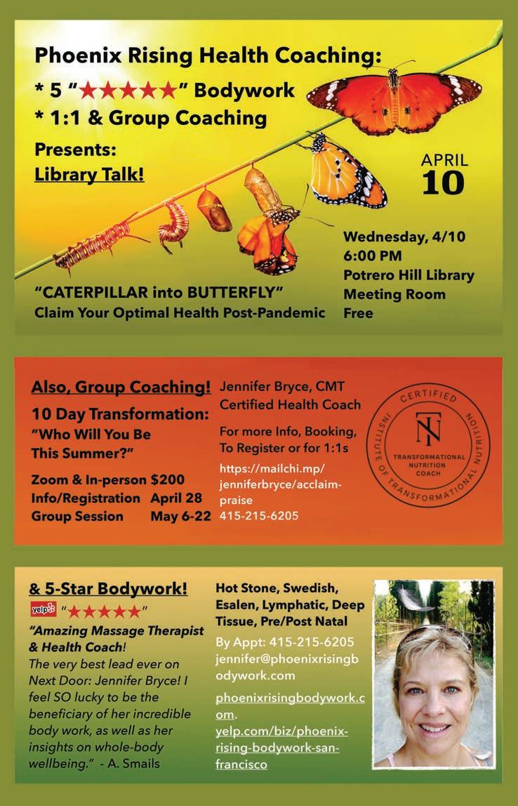 3 THE POTRERO VIEW APRIL 2024 Subscribe to the View! HANDY NUMBERS District 10 Supervisor 415.554.7670 Shamann Walton waltonstaff@sfgov.org Recology 415.330.1300 San Francisco Animal Care and Control 415.554.6364 San Francisco Fire Department (non-emergency) 415.558.3200 San Francisco Police Department 671-2300; tip line, 415.822.8147 SFPDBayviewStation@sfgov.org SFHOT/Homeless Outreach Team 311 or 415.734.4233 State Senator Scott Weiner 415.557.1300 For a $200 annual fee your organization can be listed in Getting Involved. Contact production@potreroview.net