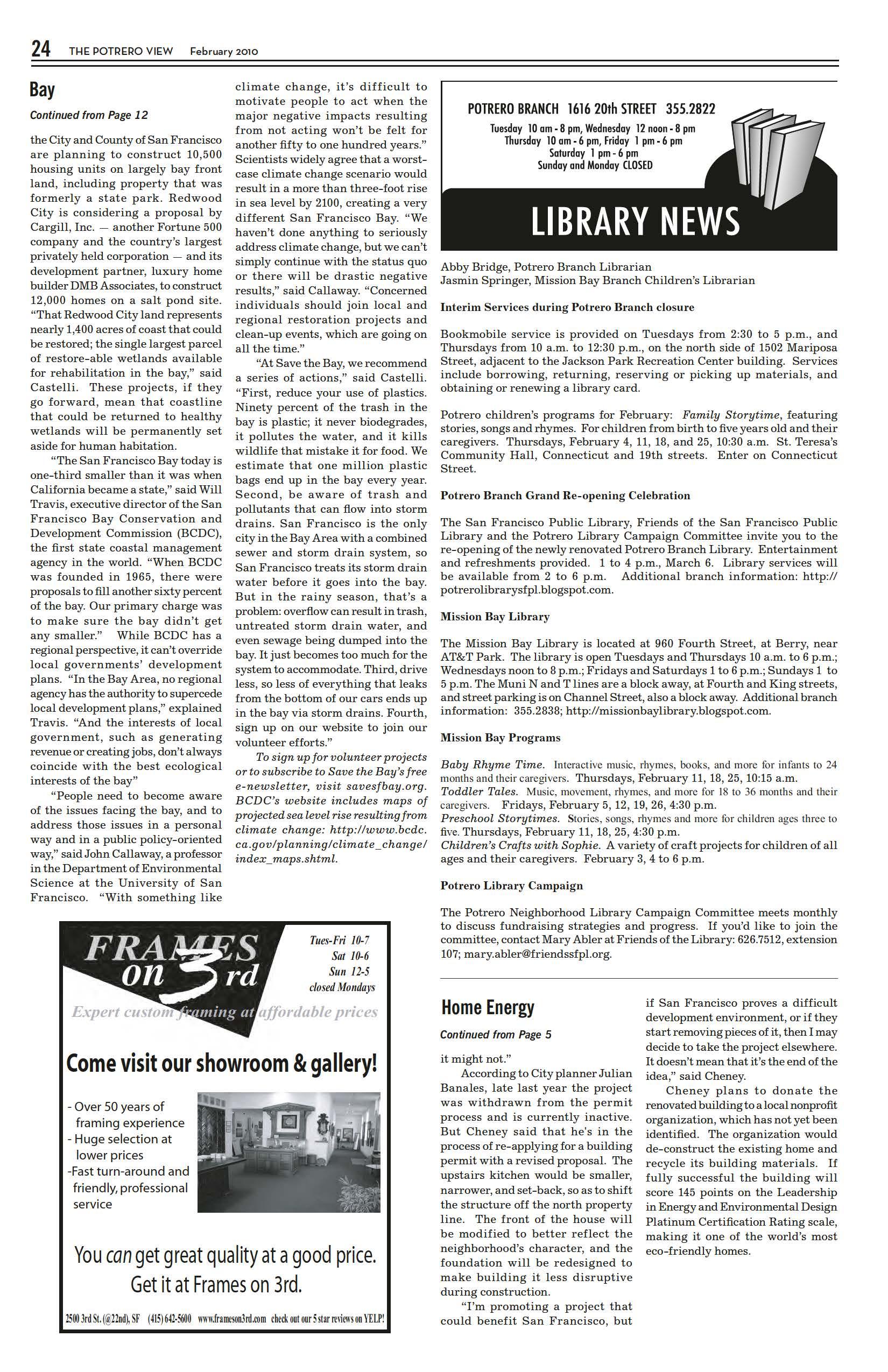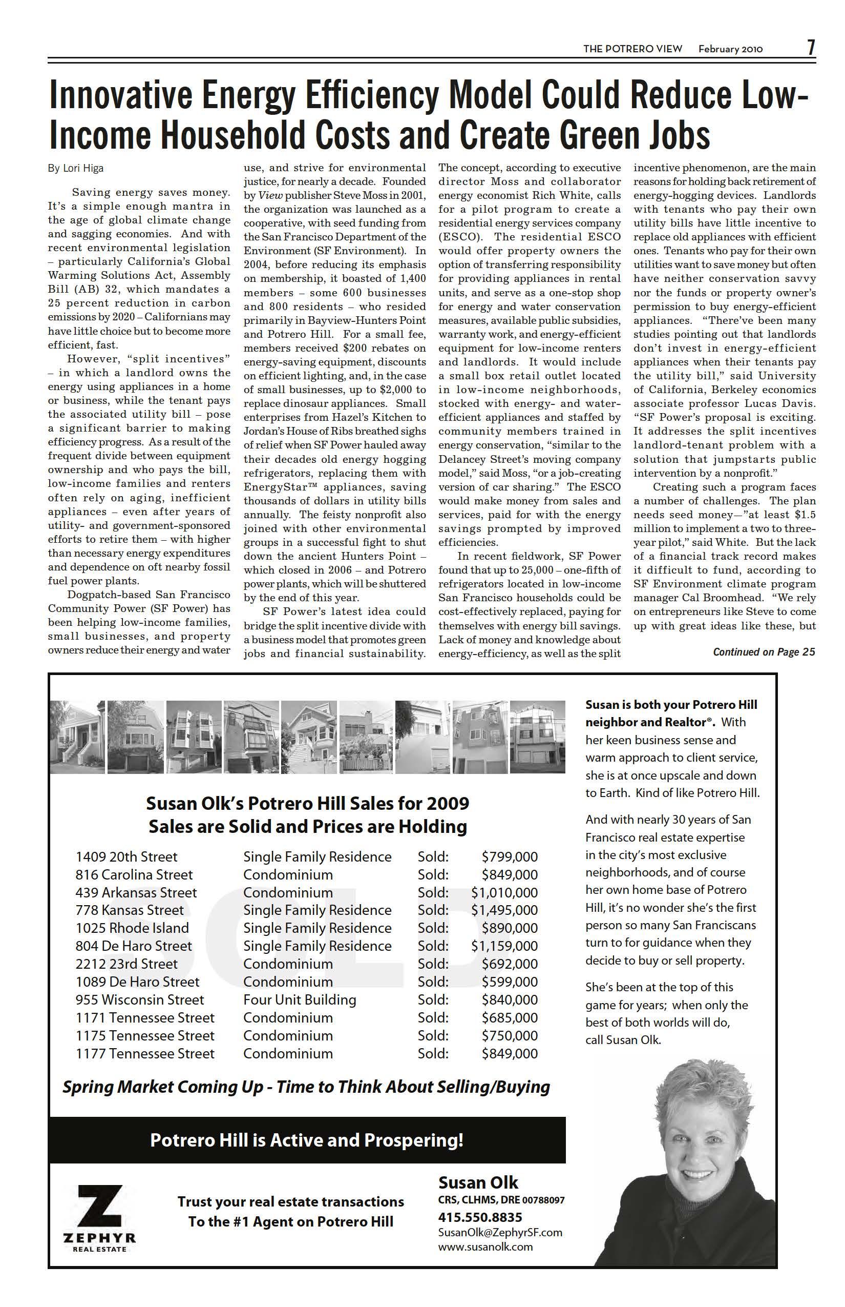 we need details that shows the plan’s viable. For example, how large is the market pool? De ne it. There needs to be deliverables, a timeline, xed costs, positive cash ow. How much will it cost to rent a small box retail space? How many appliances, how many repairs, how many jobs will be generated, what are the margins, how will it scale?” Even if the proposal had these speci cs, however, there’s no money to fund it. SF Environment has opted to invest much of its federal stimulus funds to replace large central heating systems in multi-unit buildings. Broomhead suggested that legislation may be the fastest way to jumpstart SF Power’s proposal, or a collaboration with existing retailers, such as appliance dealers or hardware stores, “to get your feet wet, see if it works.”